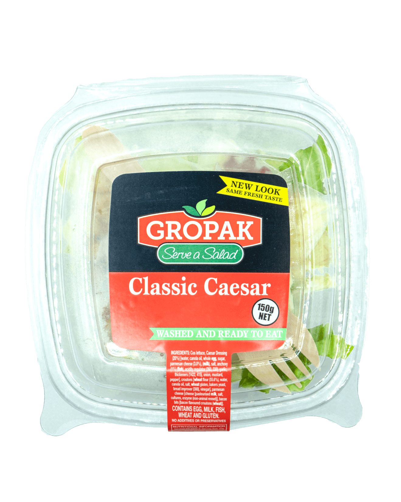 Lettuce (40%), cherry tomatoes, Cos lettuce, Caesar Dressing (water, canola oil, whole egg, sugar, parmesan cheese (3.0%), (milk), salt, anchovy (1%) ( acidity regulator (260,330), garlic, thickeners (1422, 415), onion, mustard, pepper), croutons [wheat flour (55.6%), water, cam oil, salt, wheat gluten, bakers yeast, bread improver (300), vgar, parmesan cheese (cheese (pasteurised milk, salt, coul enzyme (non-animal rennet)]), bacon bits (bacon flavoured croutons (wheat)]. Contains Egg, Milk Fish, Wheat and Gluten.
