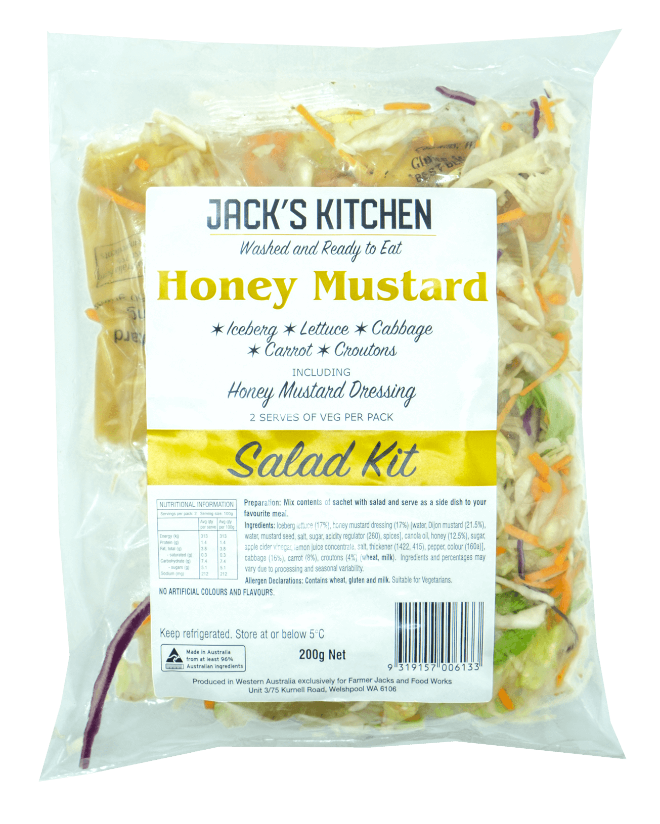 Iceberg lettuce (17%), honey mustard dressing (17%) (water, Dijon mustard (21.5%). water, mustard seed, salt, sugar, acidity regulator (260), spices), canola oil, honey (12.5%), sugar, apple cider vinegar, lemon juice concentrate, salt, thickener (1422, 415), pepper, colour (160a)), cabbage (16%), carrot (8%), croutons (4%) (wheat, milk).