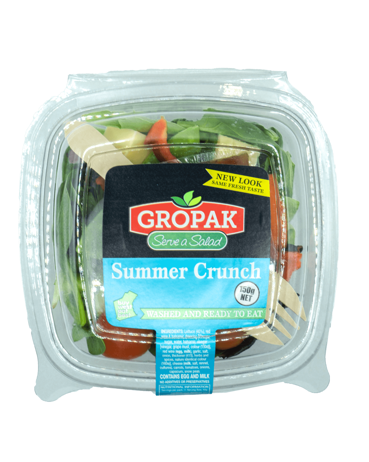 Lettuce (40%), redwine & balsamic dressing Vinegar, sugar, water, balsamic vinegar [vinegar, grape must, colour (150d)], red wine (egg, milk), garlic, salt, onion, thickener (415), herbs and spices, nature identical colour (160e)), cheese (milk, salt, rennet, cultures), carrots, tomatoes, onions, capsicum, snow peas.