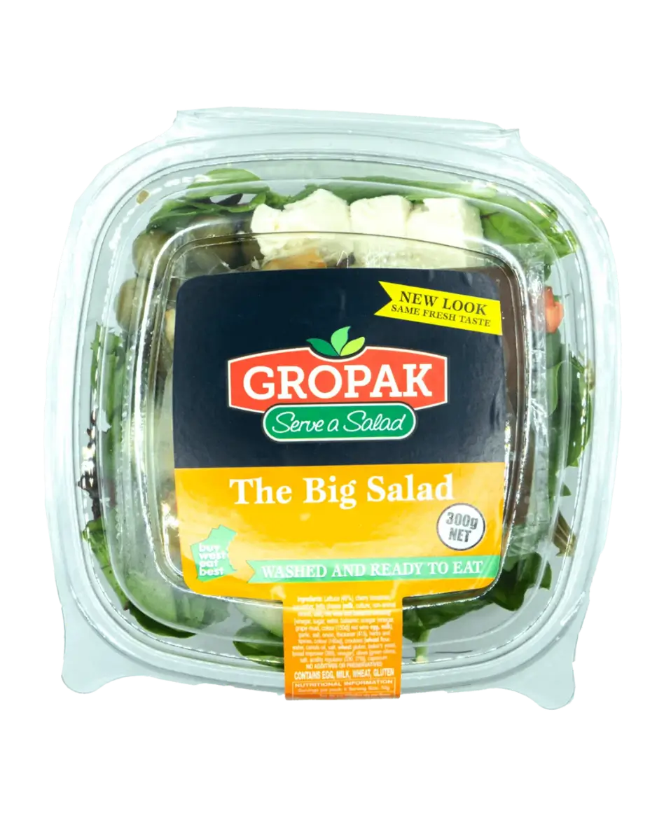 Lettuce (40%), cherry tomatoes, cucumber, fetta cheese (milk, culture, non-animal rennet, salt), red wine and balsamic dressing [vinegar, sugar, water, balsamic vinegar (vinegar, grape must, colour (150d)) red wine egg, milk), garlic, salt, onion, thickener (415), herbs and spices, colour (160e)], croutons [wheat flour, water, canola oil, salt, wheat gluten, baker’s yeast, bread improver (300), vinegar), olives [green olives, salt, acidity regulator (330, 270)], capsicum.